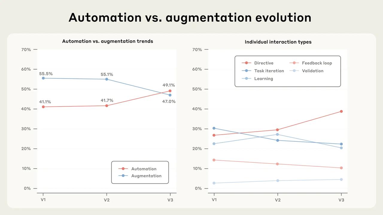 Доля "директивных" разговоров с Claude выросла с 27% до 39%. Люди не просят помочь — они делегируют полные задачи. В бизнесе 77% запросов - через API в рамках задач автоматизации.